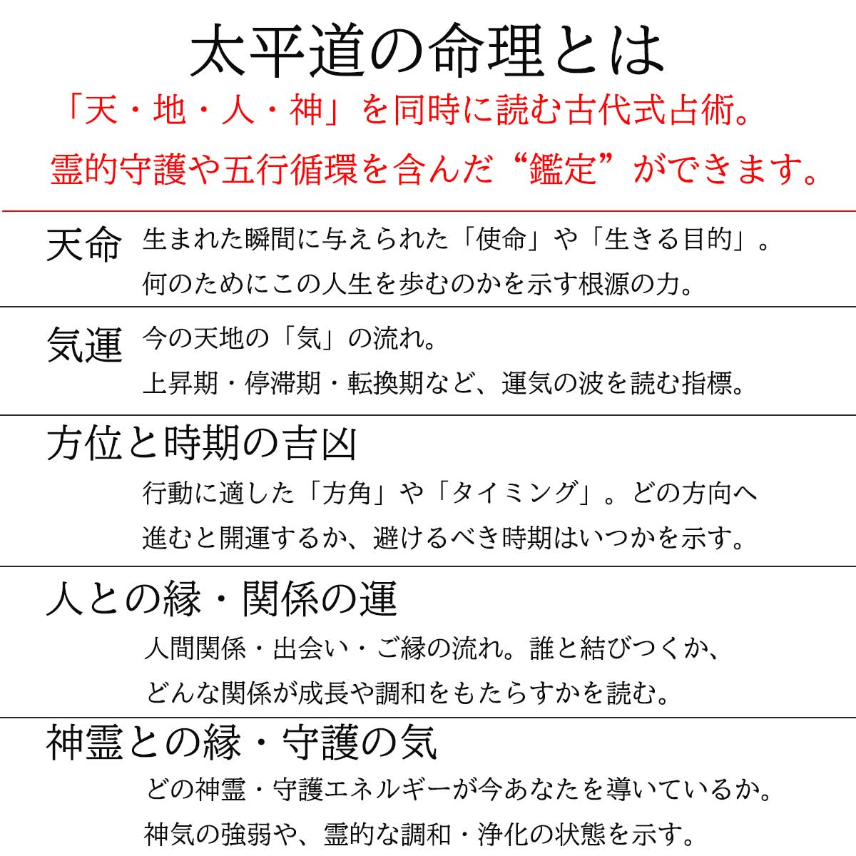 天地の理(ことわり)を知り、運命の流れを整える。 それは古代より伝わる「天命を知る」という、最も静かで力強い占いです。