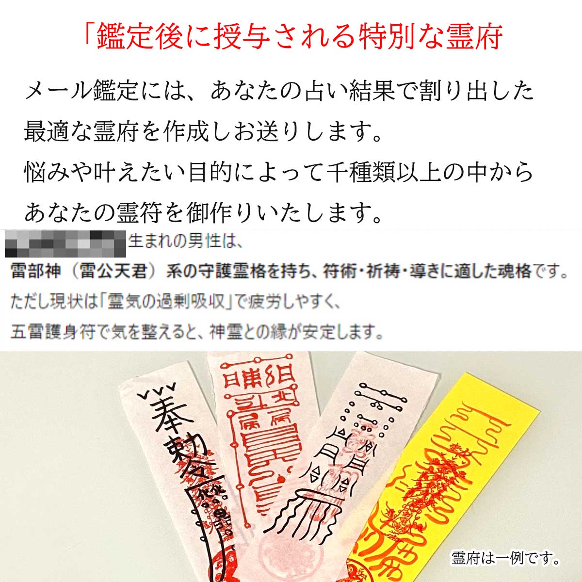 ・霊府(護符)はすべて手書き・加持の上で発送いたします。 ・効果や体感には個人差があります。霊府は信仰・祈願の補助具であり、医療行為や現実的保証を目的とするものではありません。 ・鑑定は運命や未来を断定するものではなく、心の整理と人生の指針としてご活用ください。 ・鑑定結果の転載・公開・商用利用はご遠慮ください。