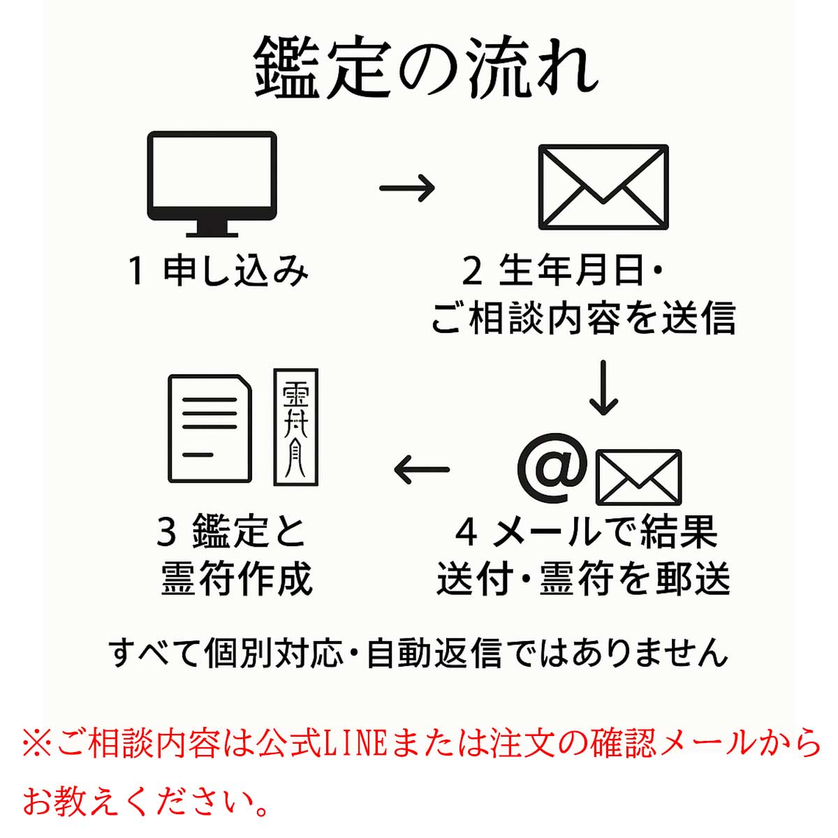 一般的なメール占いとは異なり、 本鑑定では「天地の気」を読む古道教の命理と、 霊的な加持を伴う符術を組み合わせています。 鑑定はすべて個別に行われ、 命理計算・干支判断・五行解析・神霊照応までを一体として占います。 また、結果に基づいて作成される霊府は、 願いや運勢に応じた千種類以上の中から最適な形を選び、 その人の運命の層に合わせて授与されます。